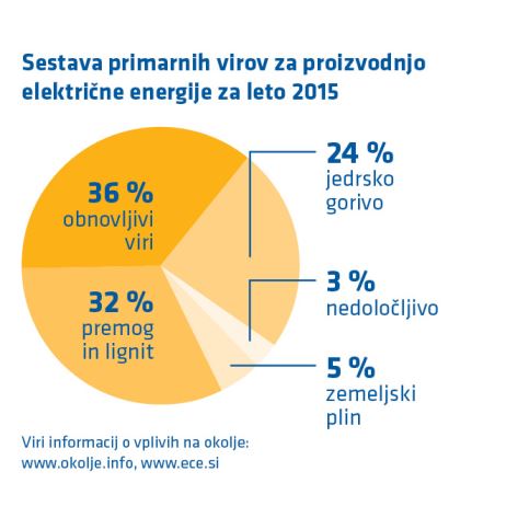 Opomba: Pri preračunu sestave primarnih virov za proizvodnjo električne energije za leto 2015 in pri preračunu izpusta ogljikovega dioksida in nastalih radioaktivnih odpadkov v letu 2015 so bili upoštevani podatki skupne preostale sestave proizvodnih virov v letu 2015, katere je objavila Agencija za energijo.