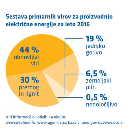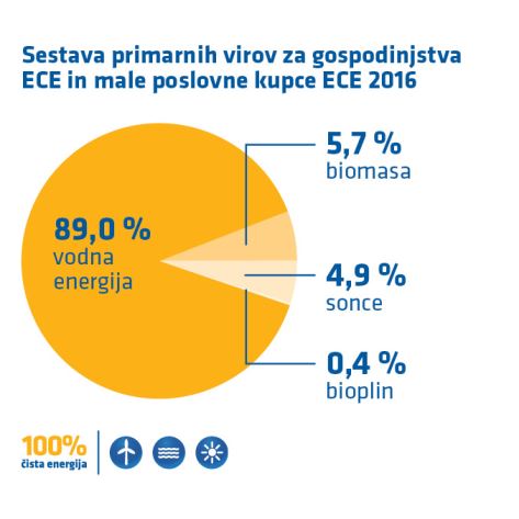 Opomba: Pri preračunu sestave primarnih virov za proizvodnjo električne energije ter pri preračunu izpusta ogljikovega dioksida in nastalih radioaktivnih odpadkov v letu 2016 so bili upoštevani podatki skupne preostale sestave proizvodnih virov v letu 2016, katere je objavila Agencija za energijo, in ECE potrdila o izvoru za leto 2016.