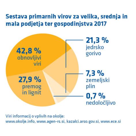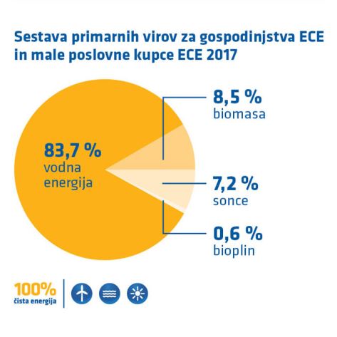 Opomba: Pri preračunu sestave primarnih virov za proizvodnjo električne energije ter pri preračunu izpusta ogljikovega dioksida in nastalih radioaktivnih odpadkov v letu 2017 so bili upoštevani podatki skupne preostale sestave proizvodnih virov v letu 2017, katere je objavila Agencija za energijo, in ECE potrdila o izvoru za leto 2017.