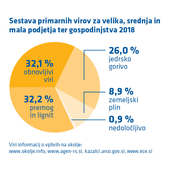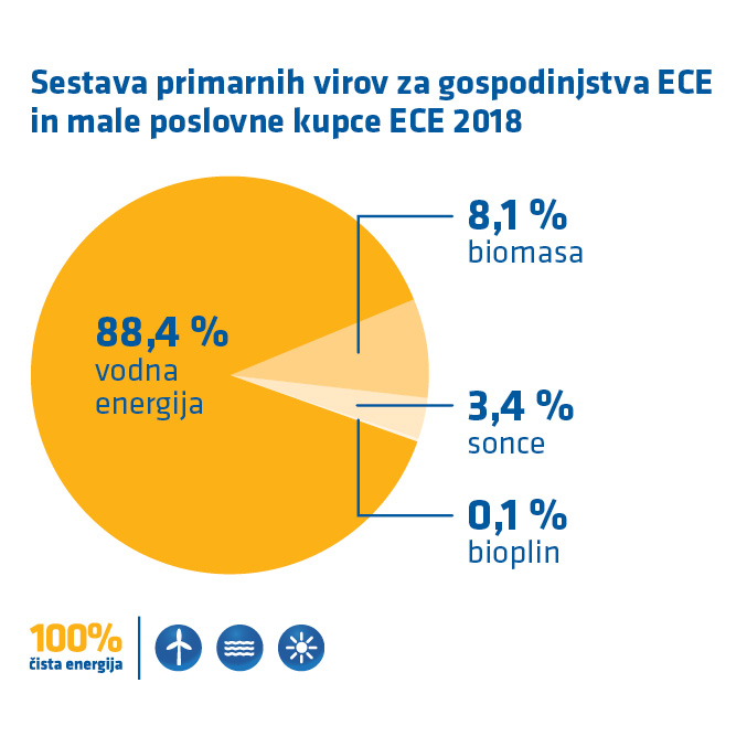 Opomba: Pri preračunu sestave primarnih virov za proizvodnjo električne energije ter pri preračunu izpusta ogljikovega dioksida in nastalih radioaktivnih odpadkov v letu 2018 so bili upoštevani podatki skupne preostale sestave proizvodnih virov v letu 2018, katere je objavila Agencija za energijo, in ECE potrdila o izvoru za leto 2018.
