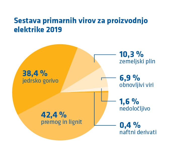 Opomba: Pri preračunu sestave primarnih virov za proizvodnjo elektrike, ter pri preračunu izpustov ogljikovega dioksida in nastalih radioaktivnih odpadkov v letu 2019 so bili upoštevani podatki skupne preostale sestave proizvodnih virov v letu 2019, katere je objavila Agencija za energijo (www.agen-rs.si na dan 3. 6. 2020) in ECE potrdila o izvoru za leto 2019.
