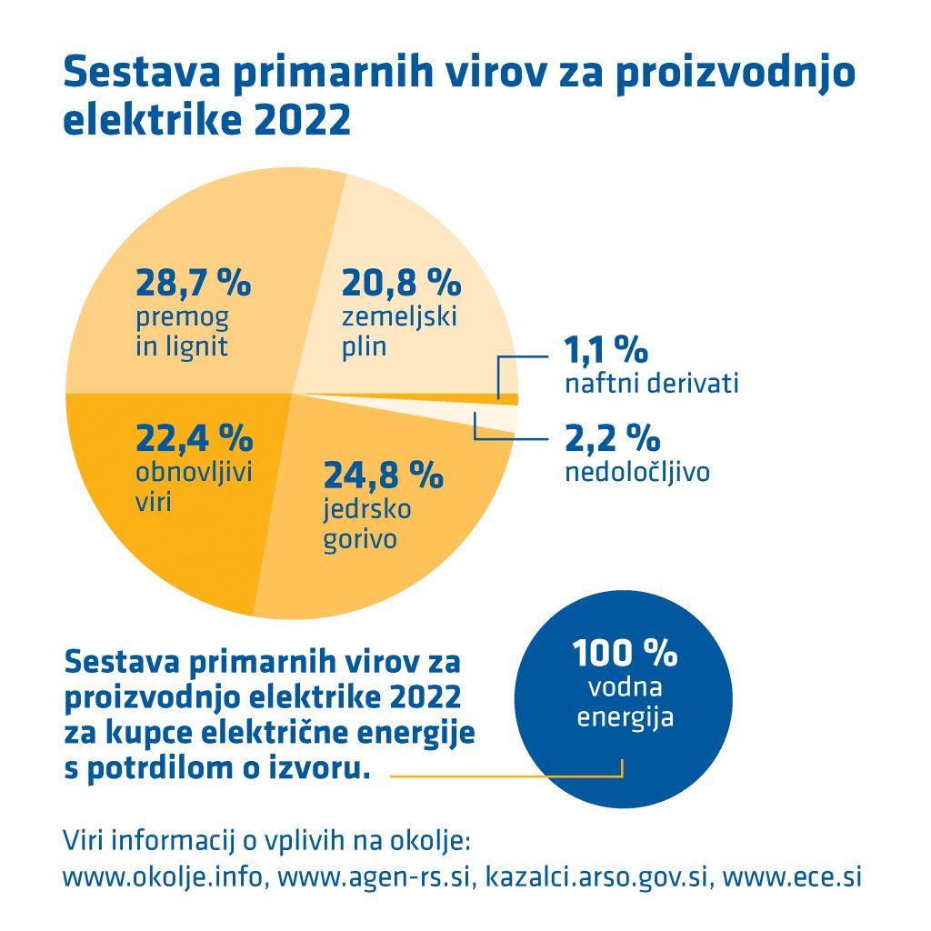 Opomba: Pri preračunu sestave primarnih virov za proizvodnjo elektrike, ter pri preračunu izpustov ogljikovega dioksida in nastalih radioaktivnih odpadkov v letu 2022 so bili upoštevani podatki skupne preostale sestave proizvodnih virov v letu 2022, katere je objavila Agencija za energijo (www.agen-rs.si na dan 6. 6. 2023) in ECE potrdila o izvoru za leto 2022.