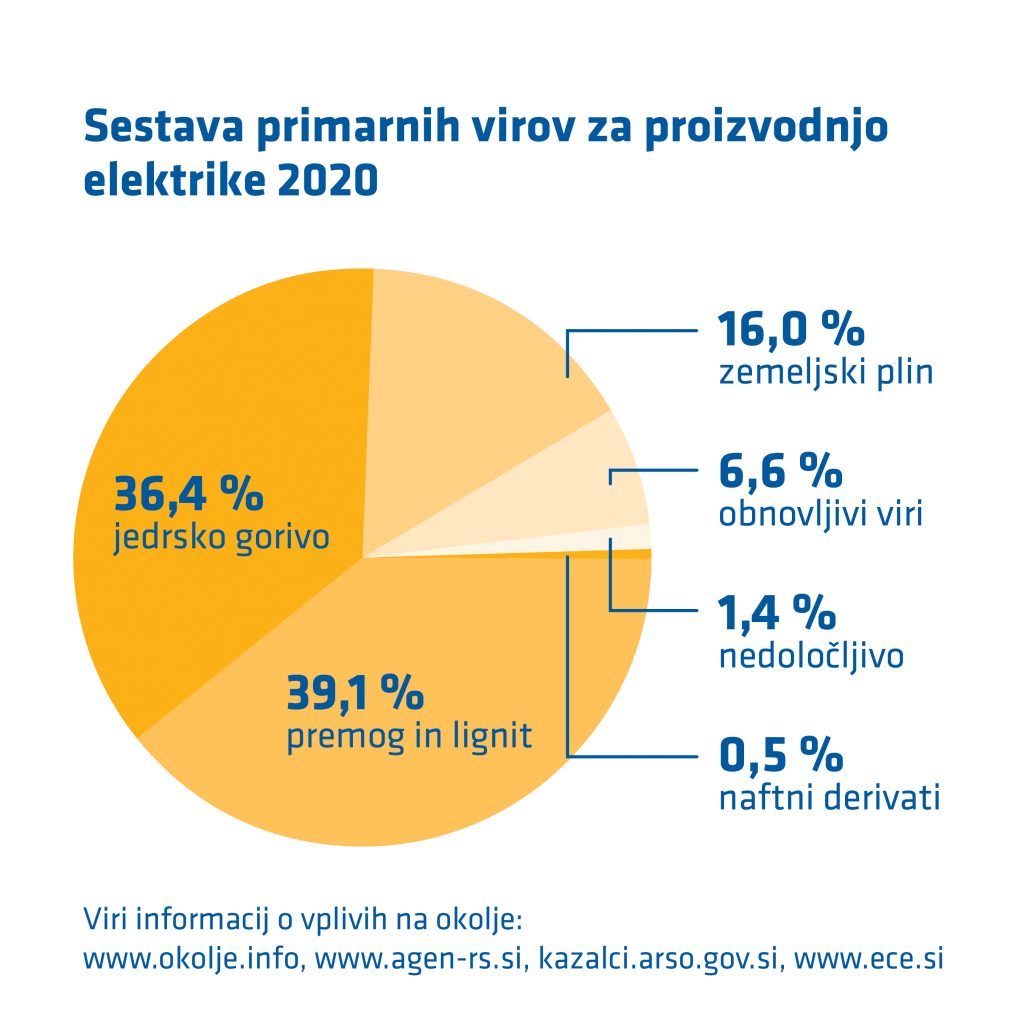 Opomba: Pri preračunu sestave primarnih virov za proizvodnjo elektrike, ter pri preračunu izpustov ogljikovega dioksida in nastalih radioaktivnih odpadkov v letu 2020 so bili upoštevani podatki skupne pod preostale sestave proizvodnih virov v letu 2020, ki jih je objavila Agencija za energijo (www.agen-rs.si na dan 3. 6. 2021) in ECE potrdila o izvoru za leto 2020.